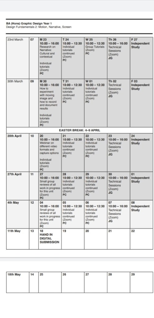 TIMETABLE FOR PROJECT Timetable, UNIT 3: MOVING IMAGE, UNIVERSITY (UCA) Share this: Share on X (Opens in new window) X Share on Facebook (Opens in new window) Facebook Like Loading... Related